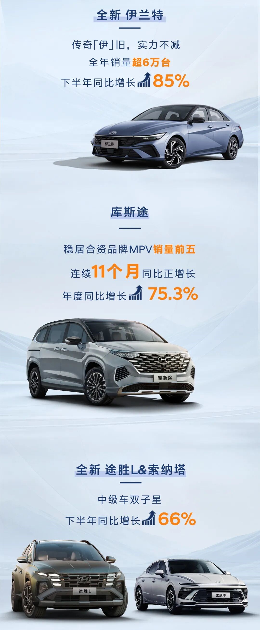 具體來(lái)看,燃油車基本盤持續(xù)夯實(shí):家用MPV車型庫(kù)斯途憑借精準(zhǔn)的市場(chǎng)定位,穩(wěn)居合資品牌MPV銷量前五,連續(xù)11個(gè)月實(shí)現(xiàn)同比正增長(zhǎng),年度增幅達(dá)75.3%;索納塔與途勝組成的“中級(jí)車雙子星”下半年銷量同比增長(zhǎng)66%,成為中級(jí)車市場(chǎng)的“中堅(jiān)力量”;經(jīng)典家轎伊蘭特延續(xù)“家轎王”口碑,全年銷量超6萬(wàn)輛,下半年同比增幅高達(dá)85%,以經(jīng)濟(jì)省油、皮實(shí)耐用的優(yōu)勢(shì)持續(xù)收獲家庭用戶青睞。